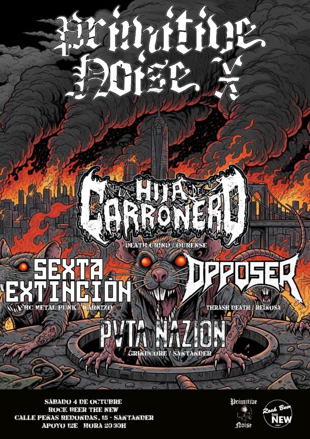 Primitive Noise X junta en el escenario de la sala Rock Beer the New a las bandas La Hija del Carroñero (Death Grind, Ourense), Opposer (Thrash Death, Reinosa), Sexta Extinción (Hc Metal Punk, Guarnizo) y Pvta Nazion (Grindcore, Santander).