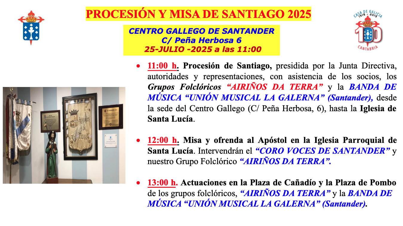 - 11:00 h. Procesión de Santiago, presidida por la Junta Directiva, autoridades y representaciones, con asistencia de los socios, los grupos folclóricos Airiños da Terra y la banda de música Unión Musical La Galerna, desde la sede del Centro Gallego (C/ Peña Herbosa, 6), hasta la Iglesia de Santa Lucía.