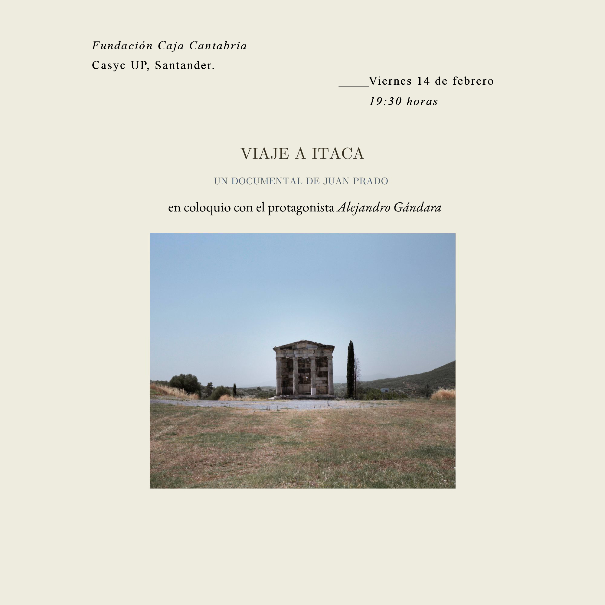 Este viernes 14 de febrero a las 19:30 horas, la Fundación Caja Cantabria acoge la presentación de Viaje a Ítaca, un documental dirigido por Juan Prado que invita al espectador a un viaje transformador a través de los sentidos y la historia de Grecia.