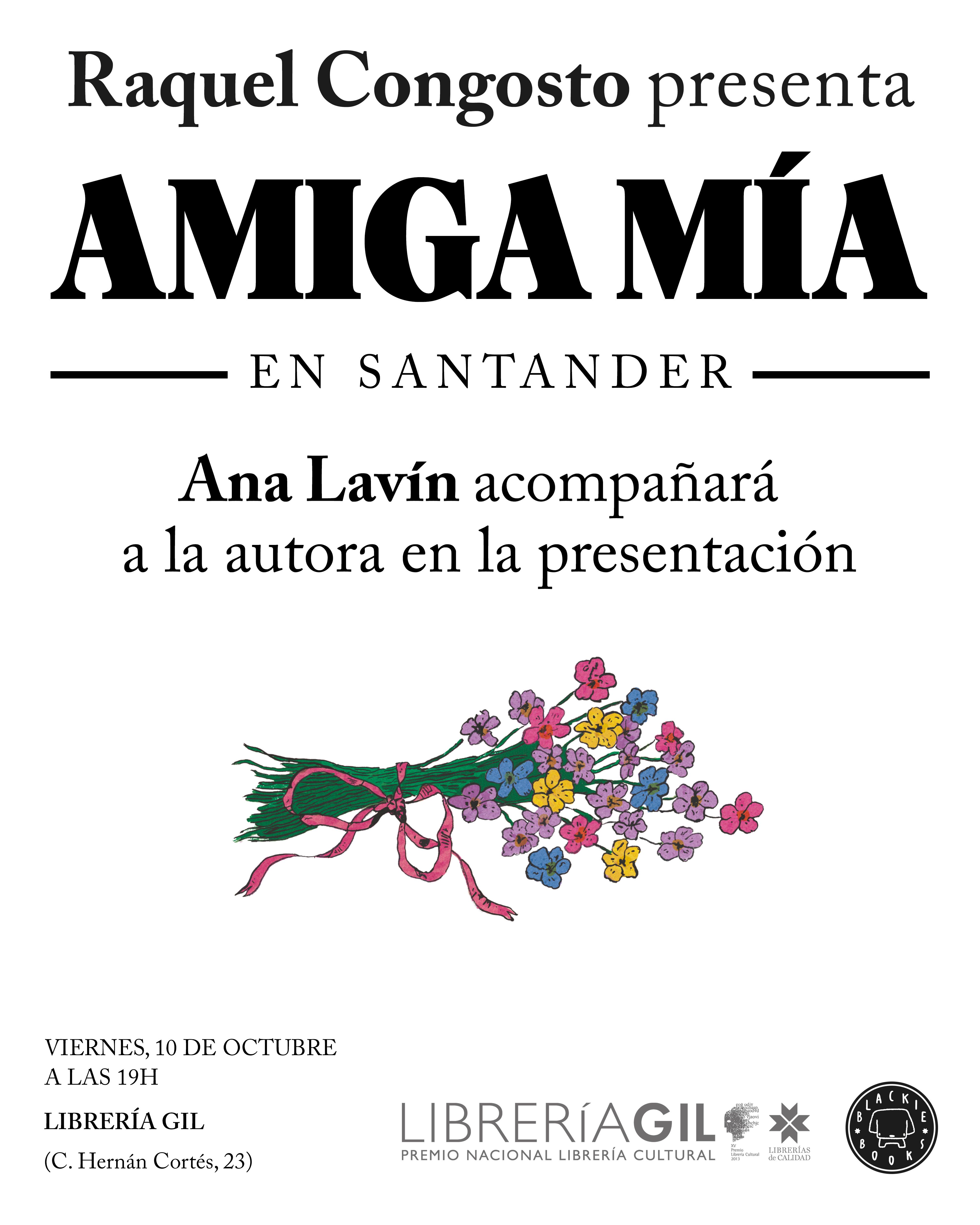 El viernes, 10 de octubre a las 19:00 h., la Librería Gil acoge la presentación de “Amiga mía”, de Raquel Congosto. La autora estará acompañada por Ana Lavín. (Editorial Blackie Books)