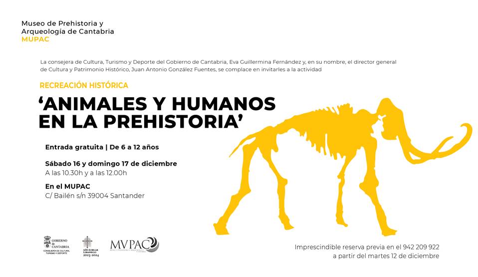 El Museo de Prehistoria y Arqueología de Cantabria (MUPAC) organiza la recreación histórica “Animales y humanos en la Prehistoria”, los días 16 y 17 de diciembre, a las 10:30 y 12:00 h. Dirigida a niñas y niños a partir de 6 años.