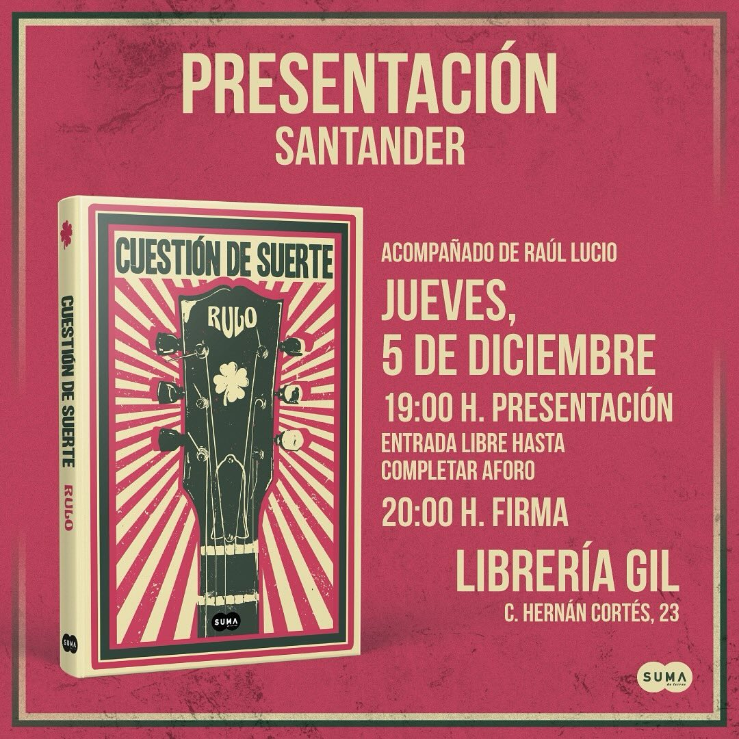 El jueves 5 de diciembre, a las 19:00 h. Gil acoge la presentación de “Cuestión de suerte”, de Rulo. El autor estará acompañado de Raúl Lucio. (Editorial Suma)