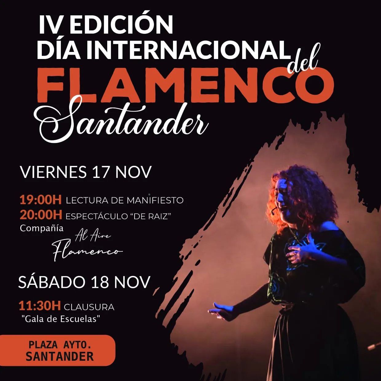 Por cuarto año, el Ayuntamiento de Santander se suma a la celebración del Día Internacional del Flamenco. El programa comenzará el viernes 17 de noviembre a las 19:00 horas con la lectura del manifiesto, que dará paso a continuación al espectáculo “De raíz” a cargo de la compañía Al Aire Flamenco.