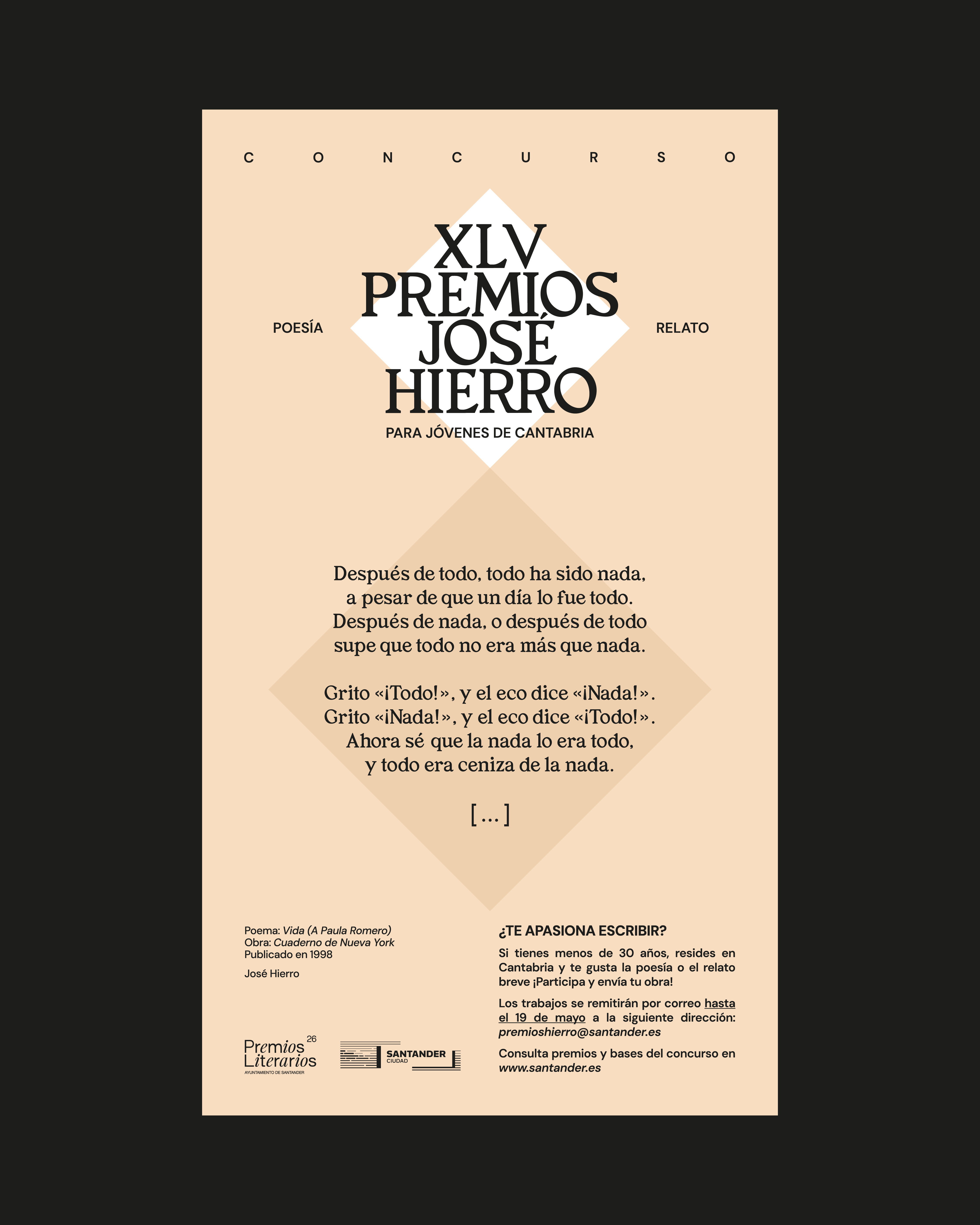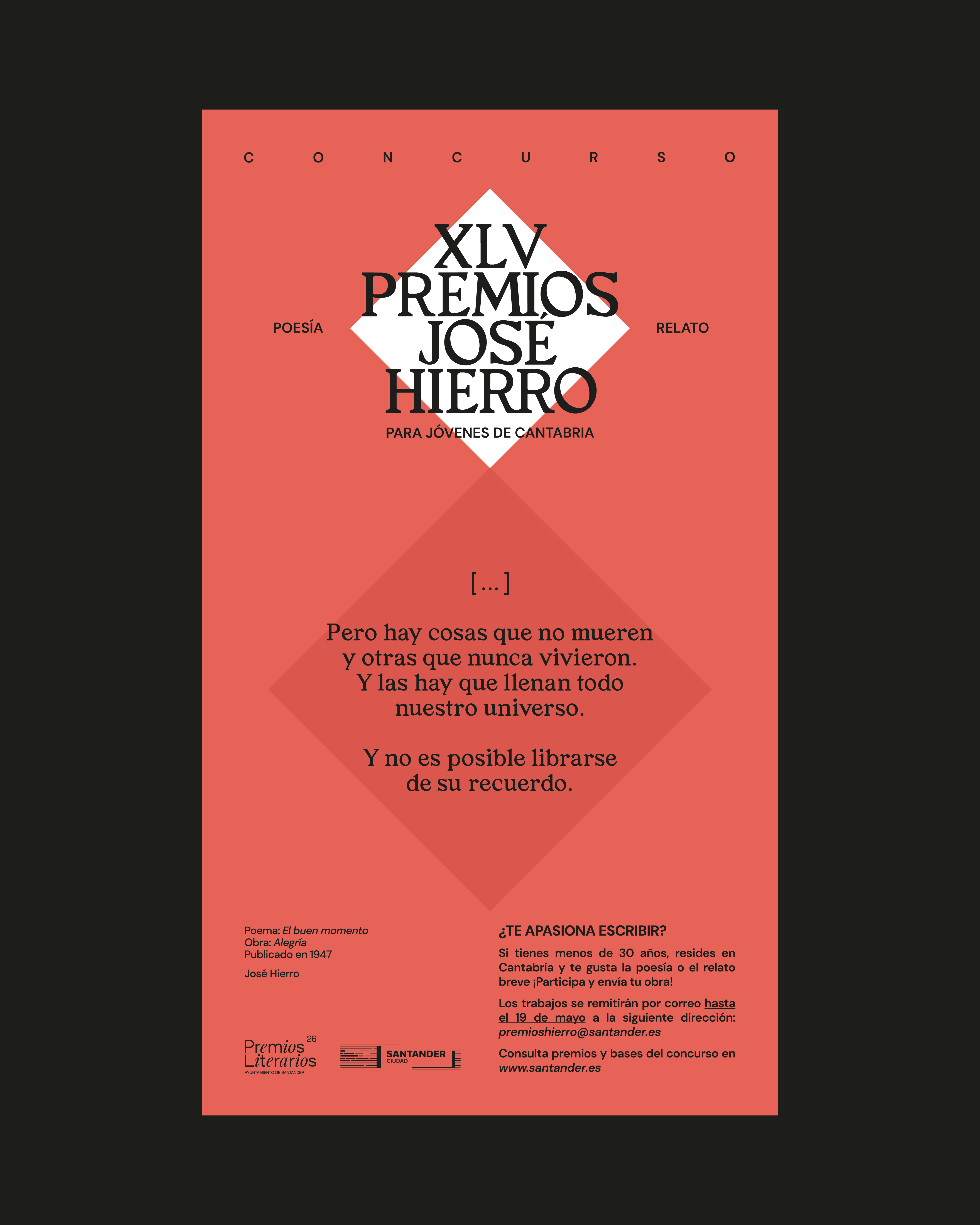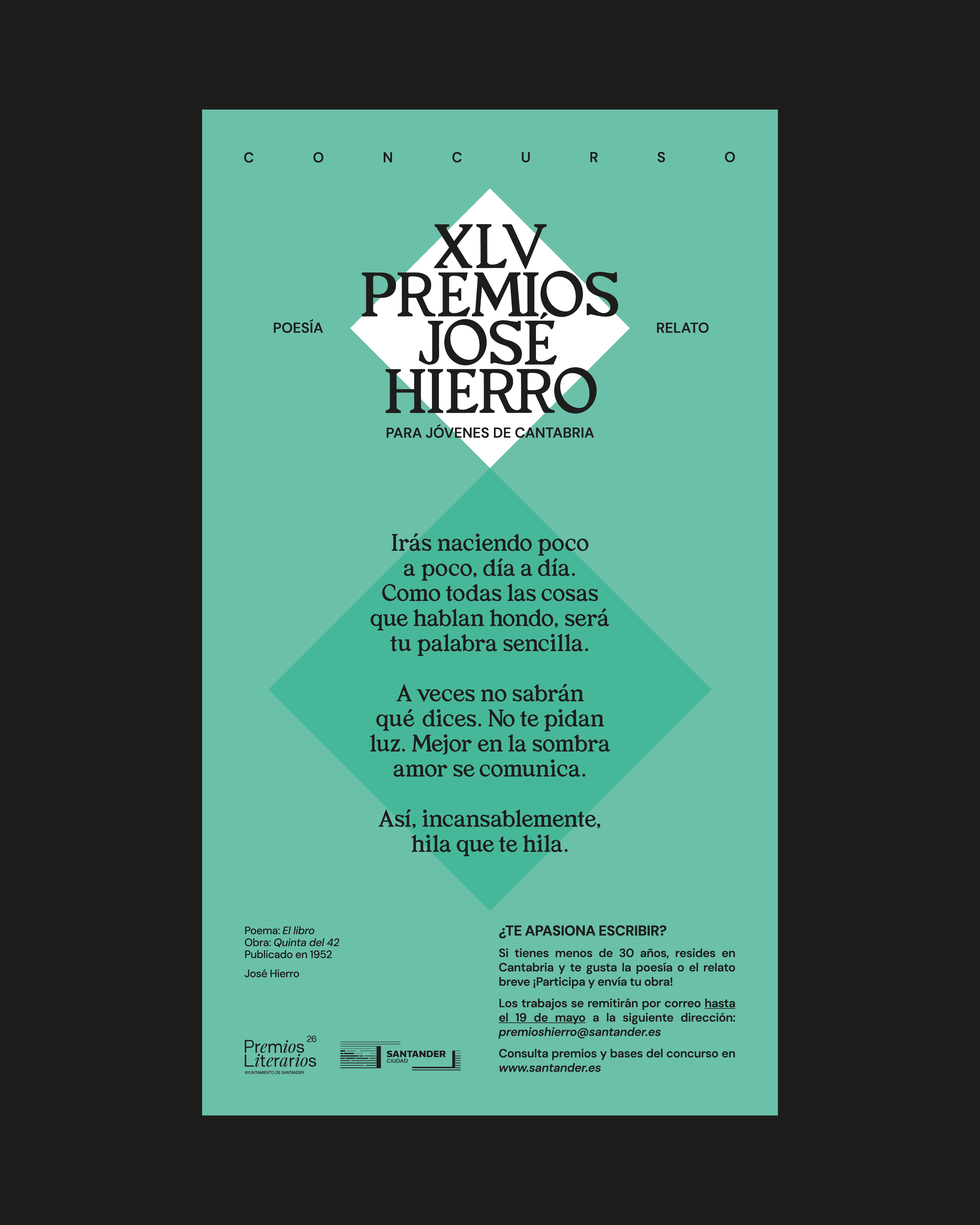 La 45ª edición de los Premios José Hierro (en las modalidades de poesía y relato breve) está destinada a jóvenes escritores de Cantabria que no hayan cumplido 30 años con anterioridad al 18 de mayo de 2026. En cada modalidad, se establece un premio de 2.000 euros además de la edición de los trabajos premiados. El plazo de presentación termina el 19 de mayo.