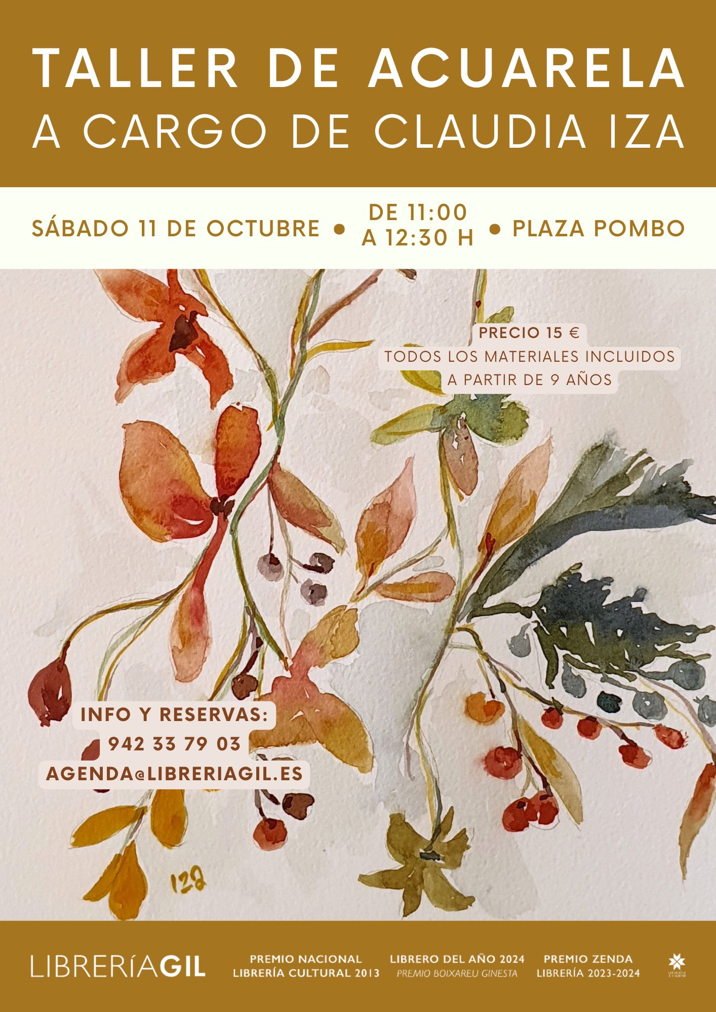 Taller de acuarela para adultos a cargo de Claudia Iza. el sábado 11 de octubre a las 11:00 h. Todos los materiales incluidos. Precio: 15€. Imprescindible reservar plaza en: 942 075 762 / info@libreriagil.es