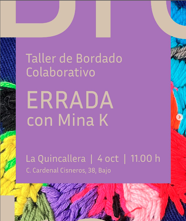 El 4 de octubre a las 11:00 horas en la tienda de lanas La Quincallera de la calle Cisneros ( nº 38, bajo) se desarrollará una sesión del taller de bordado colaborativo “Errada” dirigida al público adulto. El taller tiene un precio de diez euros e incluye materiales y un aperitivo. Para apuntarse es necesario reservar plaza en www.broteartesanía.es