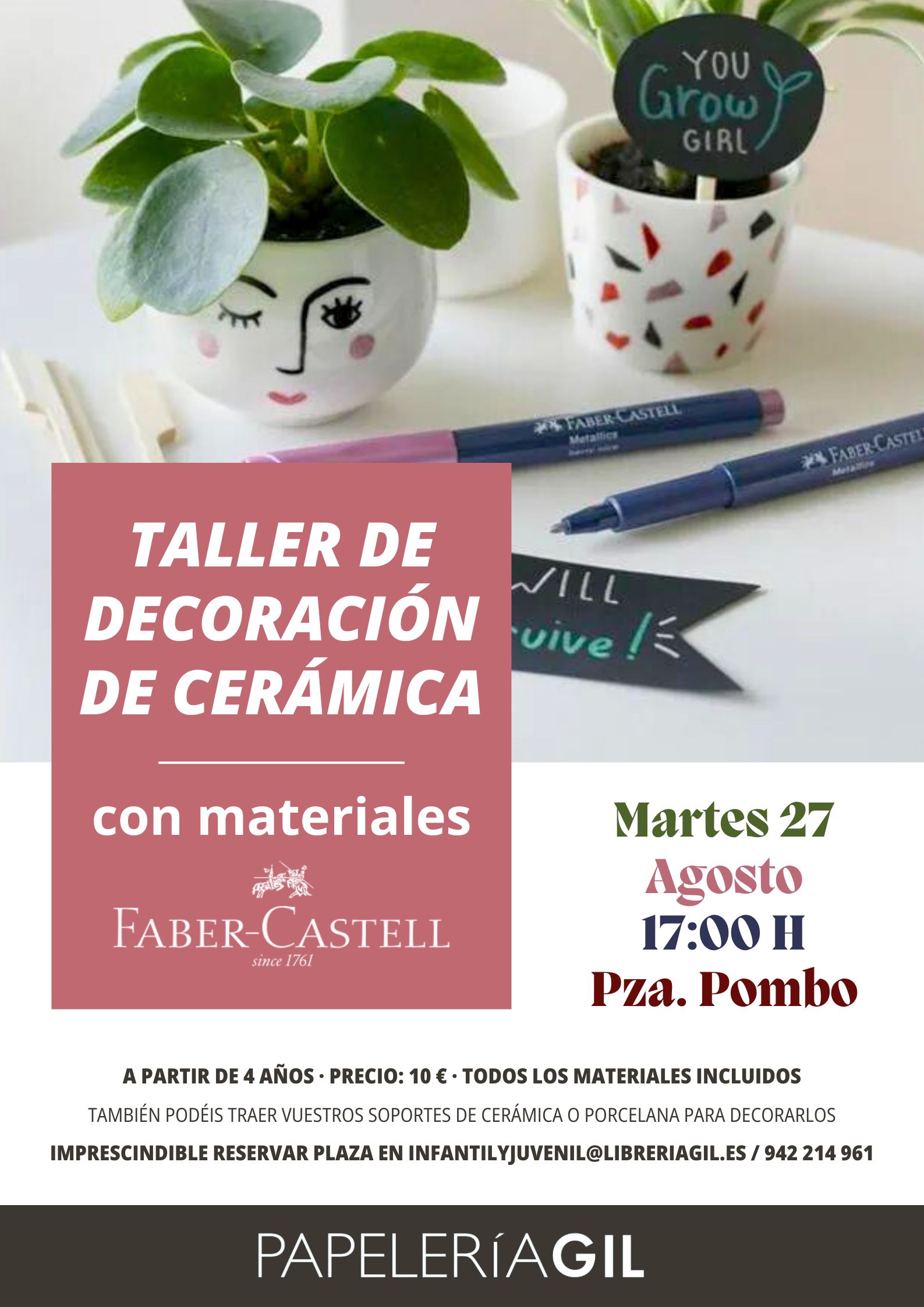 El martes 27 de agosto, a las 17:00 h. la Librería Gil organiza un taller de decoración de cerámica con materiales Faber Castell. A partir de 4 años.