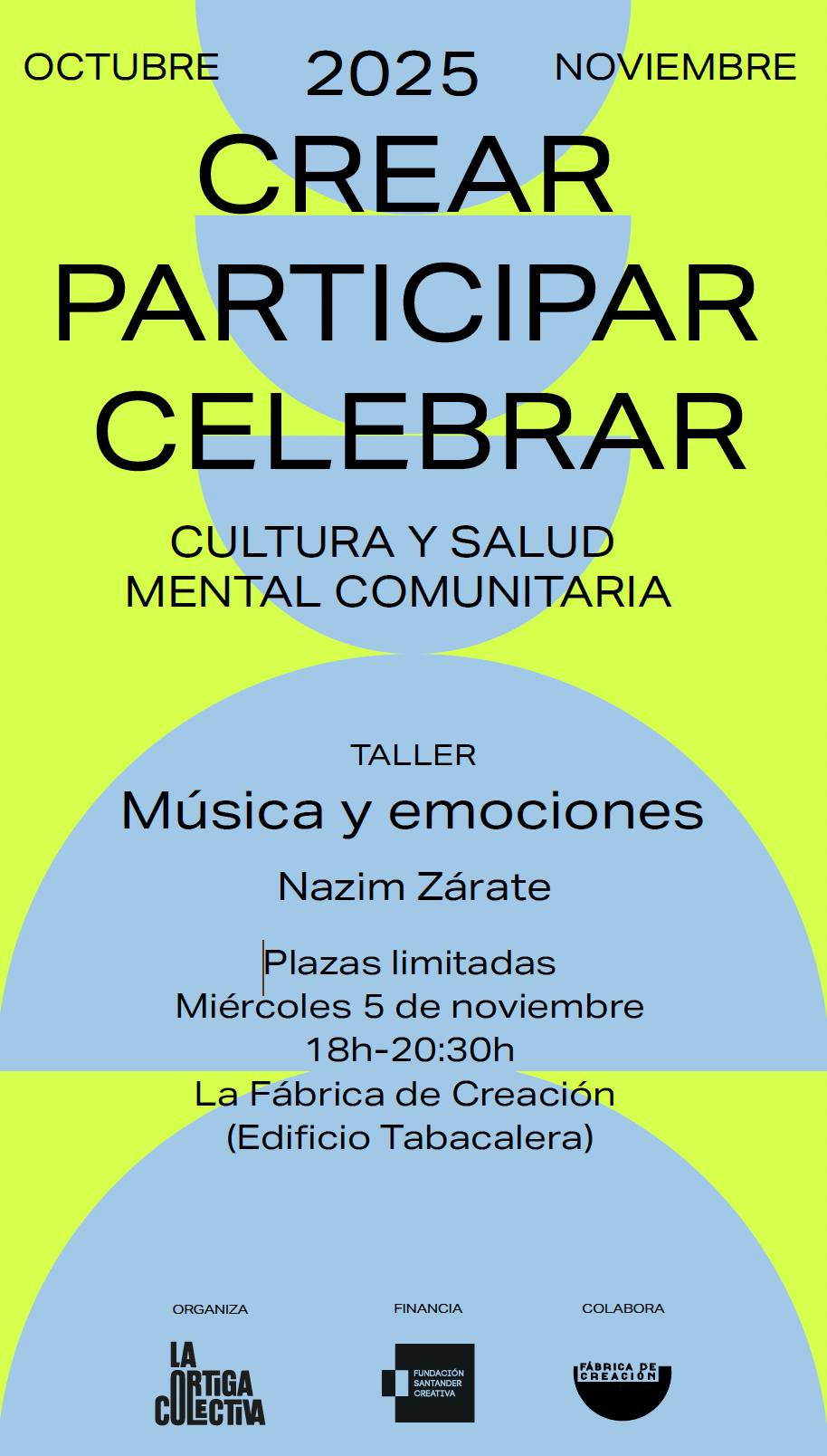 El proyecto “Crear, participar, celebrar: cultura y salud mental”, una propuesta inédita organizada por la asociación cultural La Ortiga Colectiva y reconocida en la convocatoria pública de subvenciones de la Fundación Santander Creativa (FSC), desarrolla talleres y encuentros gratuitos para demostrar el impacto positivo que genera la cultura en nuestro bienestar emocional y la necesidad de saber acompañar en los desasosiegos del sector cultural, en ocasiones invisibilizados.