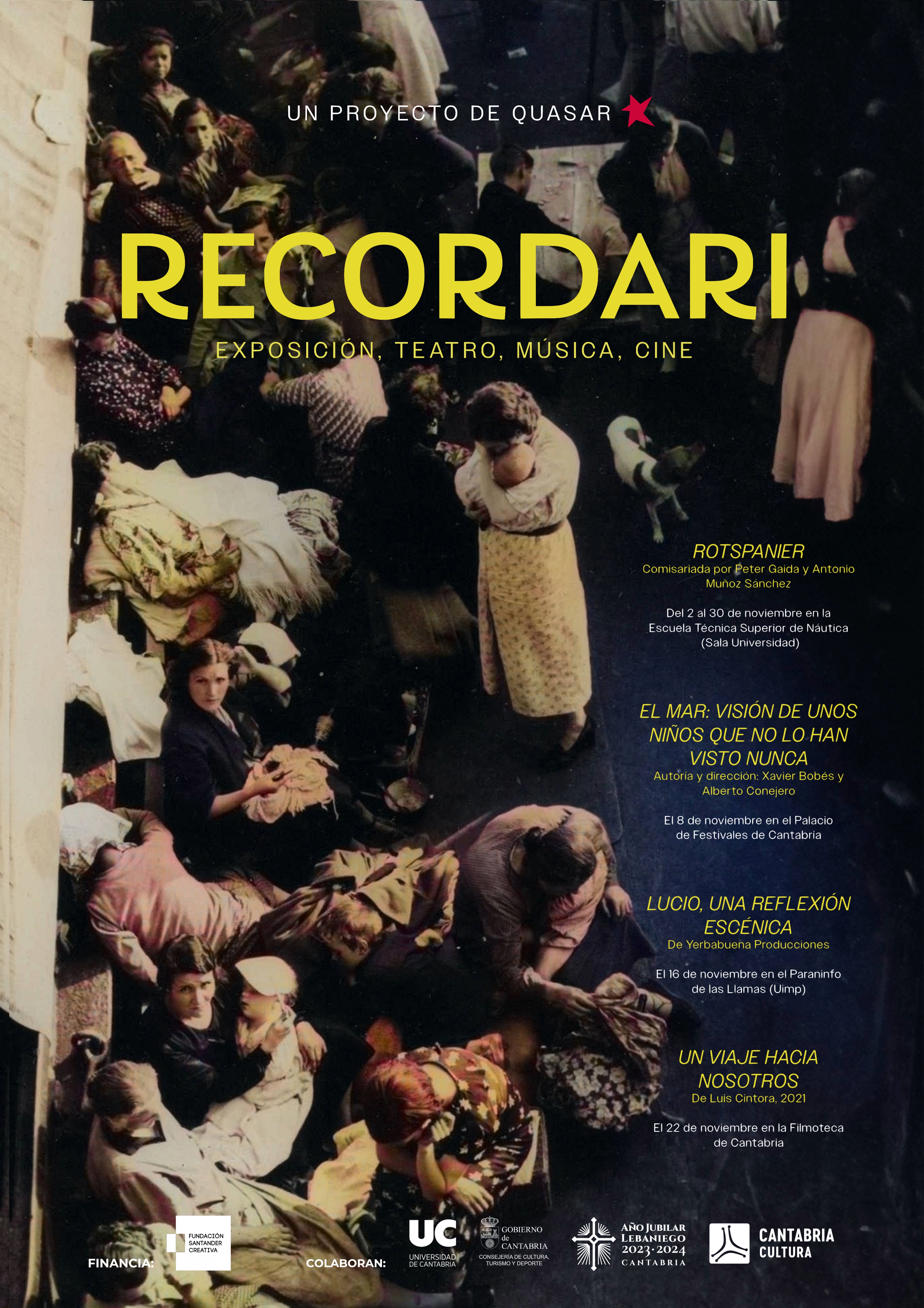 El festival RECORDARI se celebra por primera vez en Santander del 2 al 30 de noviembre. Seleccionado en la convocatoria de ayudas de la Fundación Santander Creativa (FSC), aúna varias disciplinas como las artes escénicas, el cine, la música, la fotografía y la literatura para abordar la memoria histórica y el recuerdo desde un punto de vista transversal.