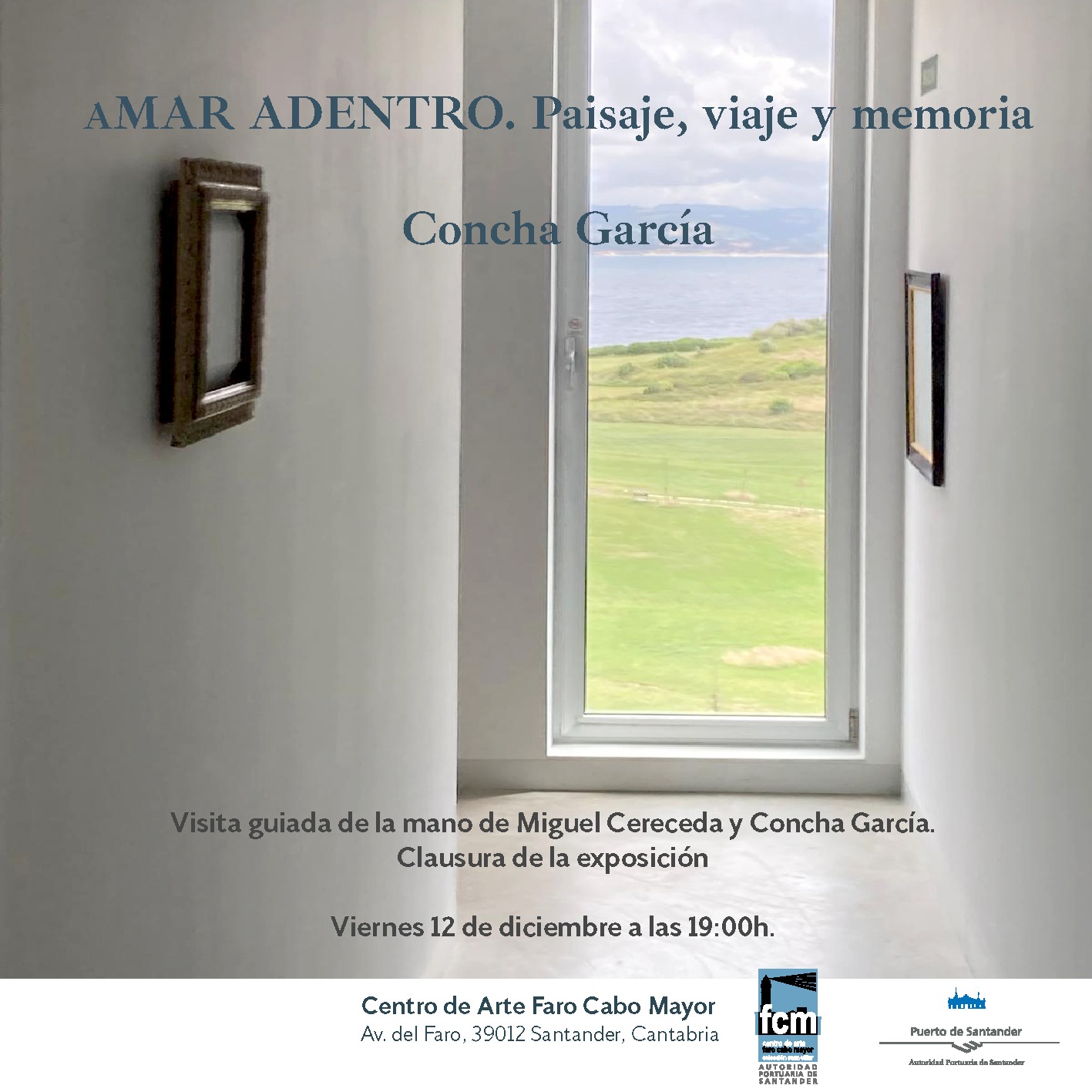 El Centro de Arte Faro Cabo Mayor (CAFCM) acoge este viernes 12 de diciembre a las 19:00 horas una visita guiada a la exposición AMAR ADENTRO. Paisaje, viaje y memoria de la mano de Concha García y de Miguel Cereceda. Esta visita significará asimismo la clausura de la exposición, que se ha mostrado en la sala Cabo Menor Temporal del Faro desde el pasado mes de julio.