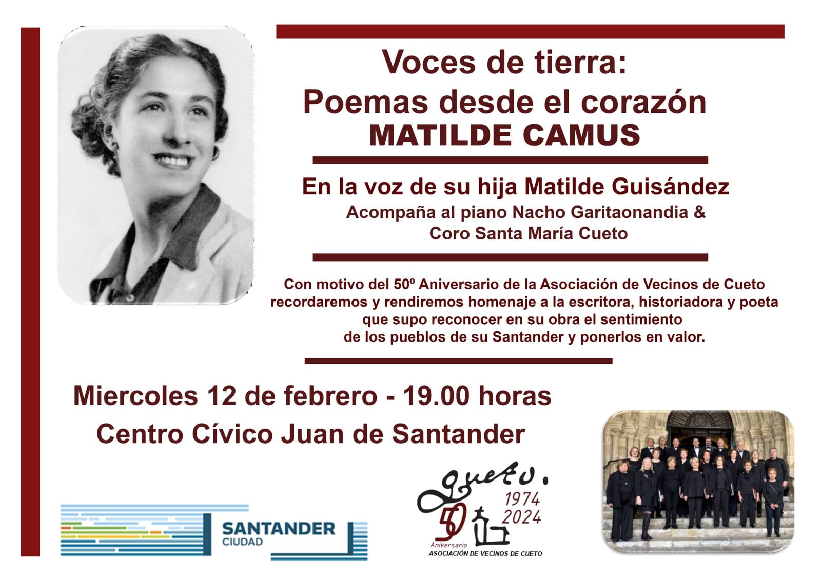 Recital poético en honor a Matilde Camus, socia de honor, en el 50 º aniversario de la asociación de vecinos de Cueto. Se trata de una lectura en la que se realizará un recorrido por su vida y obra en la voz de su hija Matilde Guisández, acompañada al piano por Nacho Garitaonandia y junto al coro Santa María de Cueto.