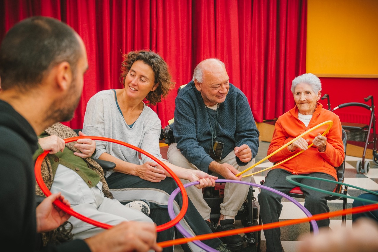 Así, se han creado espacios de juego y dinámicas usando, por ejemplo, la música para mover el cuerpo y ofrecer a los usuarios la posibilidad de abstraerse de los horarios y las directrices que rige la rutina de la residencia; permitiéndoles habitar espacios de ensoñación e imaginación y generando un estado de ánimo de alegría y relajación.