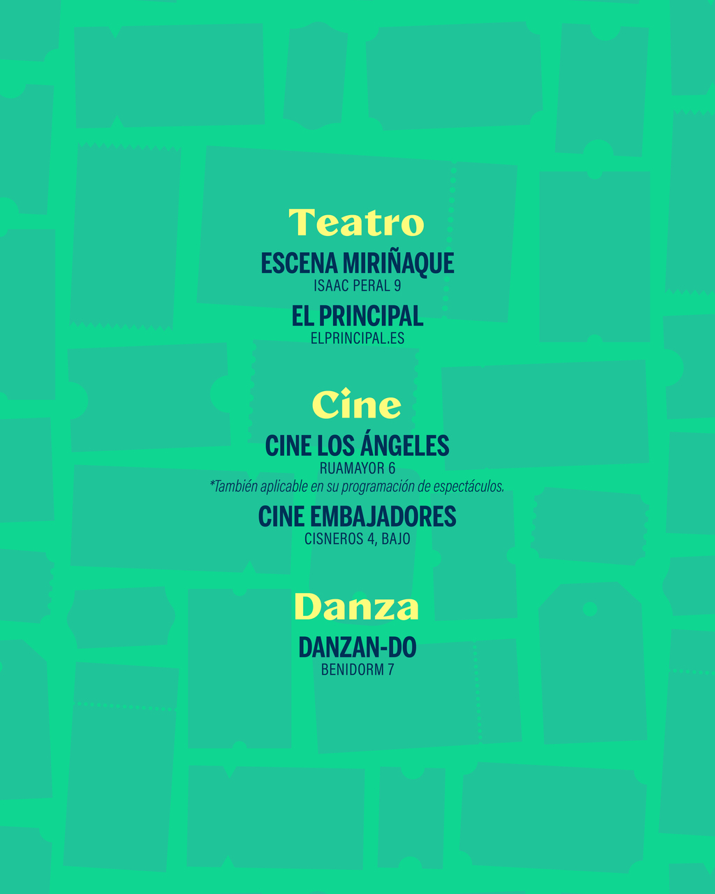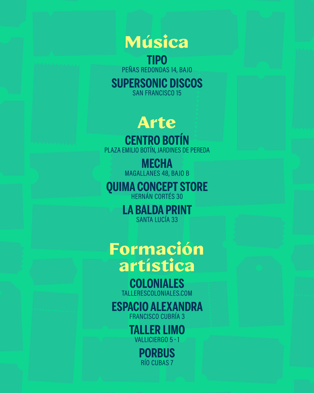 Y en Cromática, Distrito Zero y El Corte Inglés, (donde también es aplicable en música, películas y láminas). Asimismo, se puede usar en las clases de danza que ofrece el espacio Danzan-do, las inscripciones para las clases de dibujo y pintura de Espacio Alexandra, las entradas para las propuestas de Escena Miriñaque y El Principal, la tarjeta amigo del Centro Botín, en el cine Los Ángeles y en la tienda Tipo, uno de los espacios más veteranos del programa. *En Espacio Alexandra también es posible usar el bono para la compra de obras de arte.