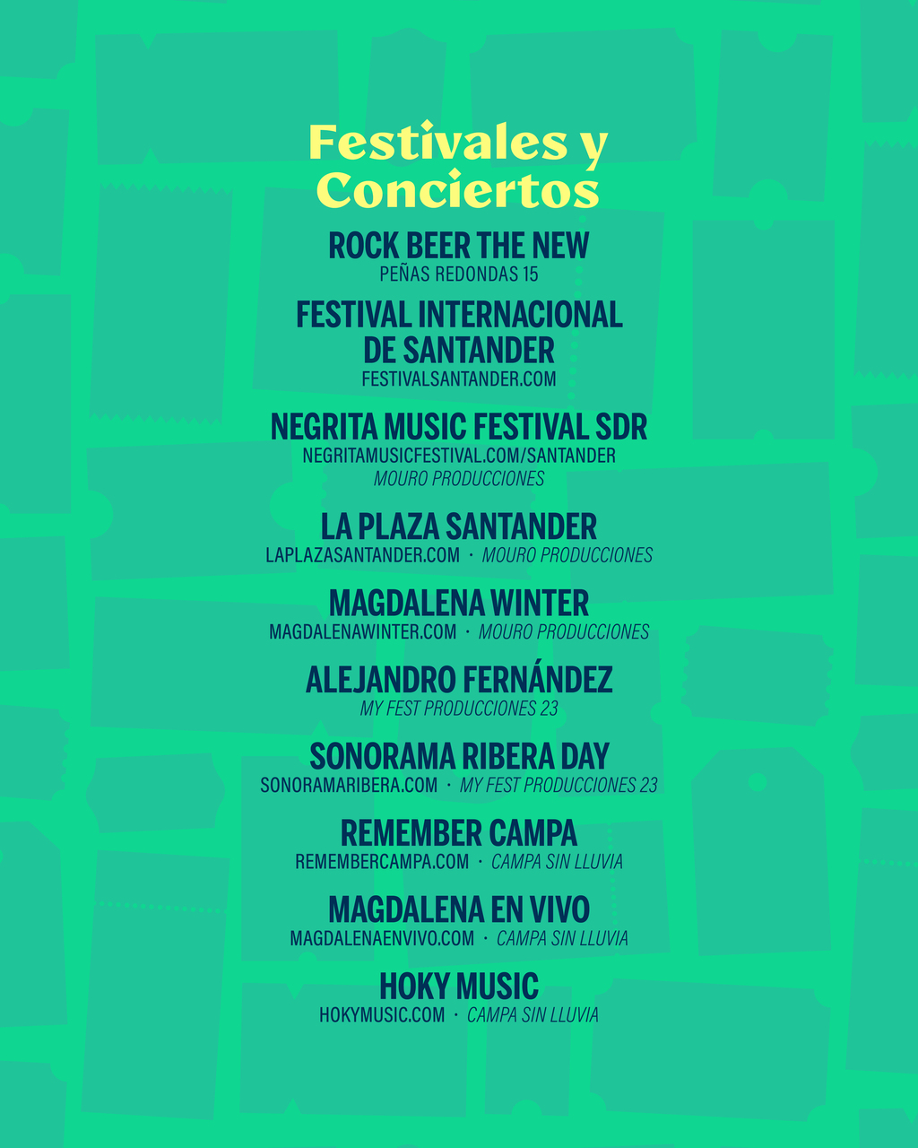 Los bonos, de igual modo, se pueden utilizar para adquirir las entradas de los conciertos de la sala Rock Beer The New y en los siguientes festivales: el Festival Internacional de Santander (FIS), el Negrita Music Festival, La Plaza, Magdalena Winter, Sonorama Ribera Day, Magdalena en Vivo, Remember Campa, Hoky Music y el concierto que orfecerá Alejandro Fernández el 22 de agosto en la Virgen del Mar.