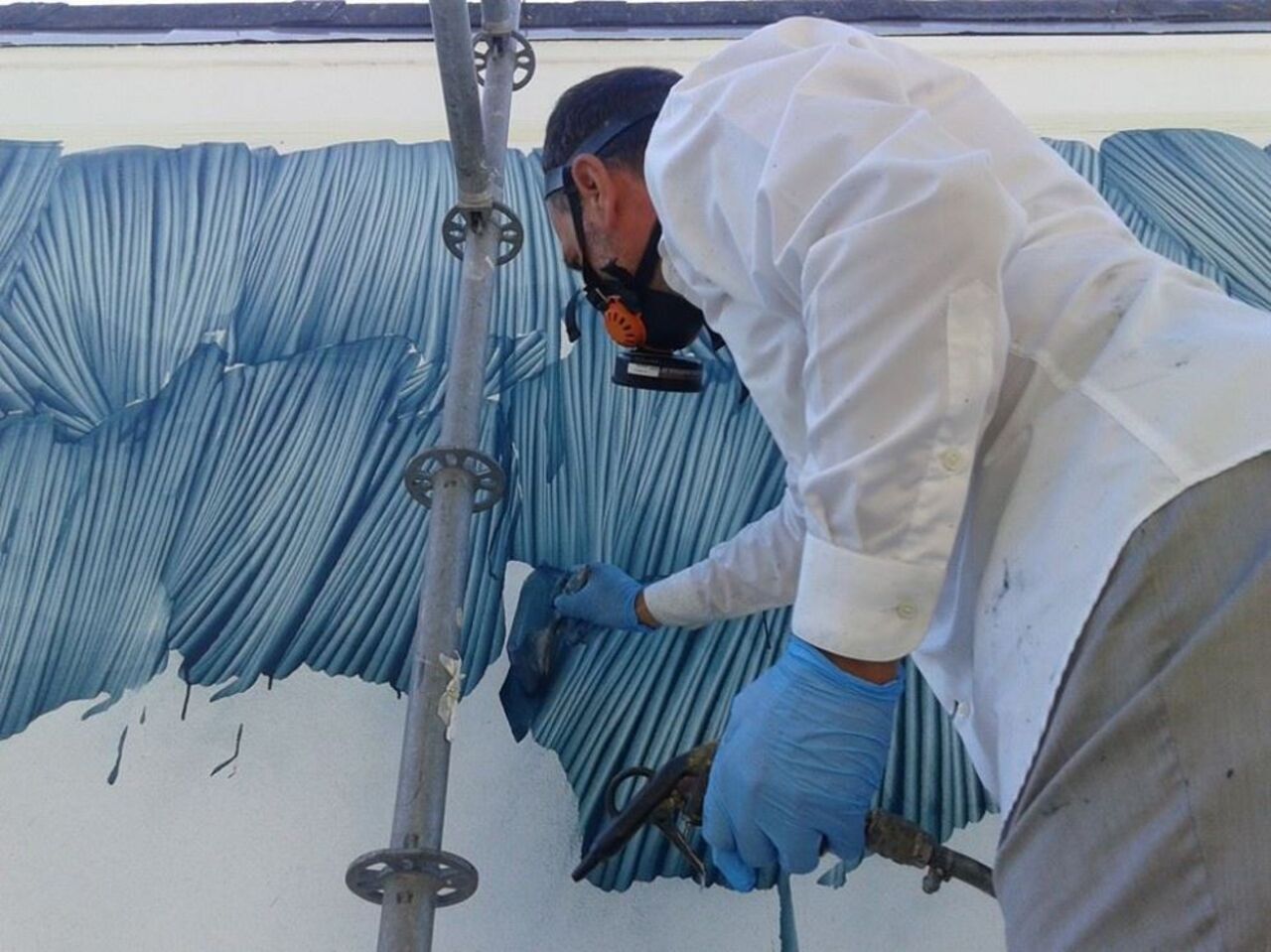 El artista leonés Daniel Verbis plasmó "Lo que oculta el viento" ante la mirada de los espectadores y paseantes en el muro de la Escuela Náutico Pesquera.
