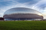 Edificio plurifuncional que se proyecta sobre la gran vaguada de Las Llamas, que alberga las funciones de deportes y espectáculos. Totalmente acabado en acero inoxidable, con un cerramiento de vidrio lamintar. Aforo total 6.000 personas.