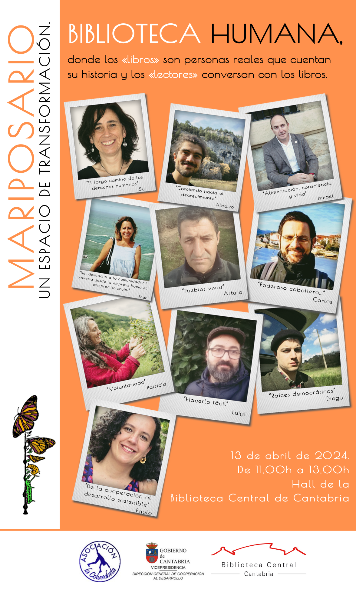 La Biblioteca Humana 'Mariposario' es una actividad de la asociación La Columbeta que cuenta con la subvención de la Dirección General de Cooperación para el Desarrollo, Juventud y Voluntariado y el apoyo de la Biblioteca Central de Cantabria. Tendrá lugar en el Hall de la Biblioteca Central de Cantabria el sábado 13 de abril de 11.00h a 13.00h. y para participar como persona lectora es imprescindible inscribirse en: https://forms.gle/aUjZ48Qiumiey2av7