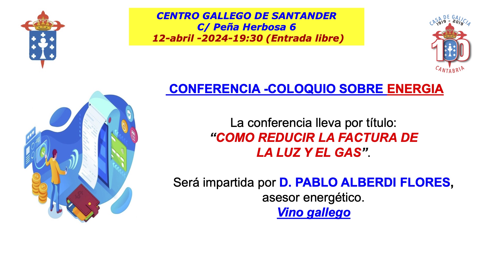 El viernes 12 de de abril, a las 19:30 horas el Centro Gallego acoge una conferencia-coloquio sobre energía, que lleva por título “Cómo reducir la factura de la luz y el gas”.