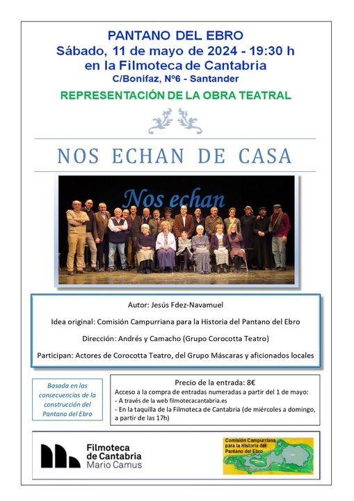 La Comisión Campurriana para la Historia del Pantano del Ebro ha organizado la representación de la obra “Nos echan de casa”, el sábado 11 de mayo, a las 19:30 h, en la Filmoteca de Cantabria. Las entradas se pueden adquirir a través de la página web www.filmotecacantabria.es y también en la taquilla de la Filmoteca de Cantabria, de miércoles a domingo, a partir de las 17 horas.
