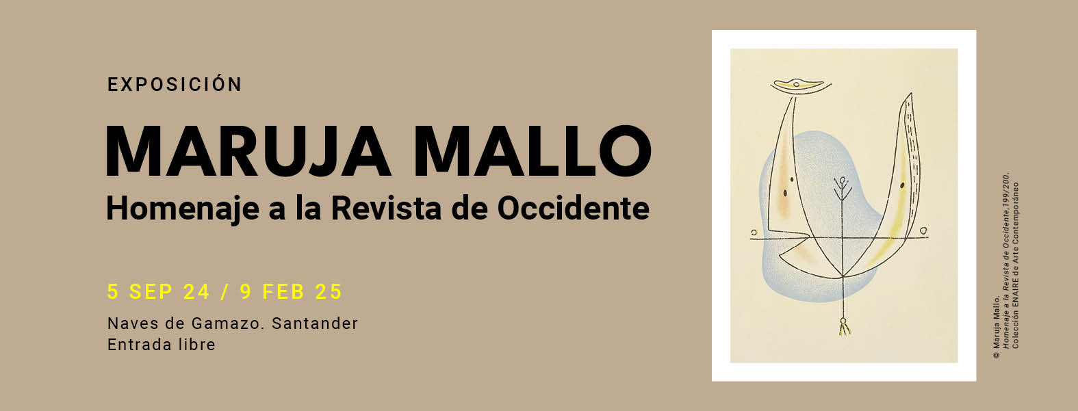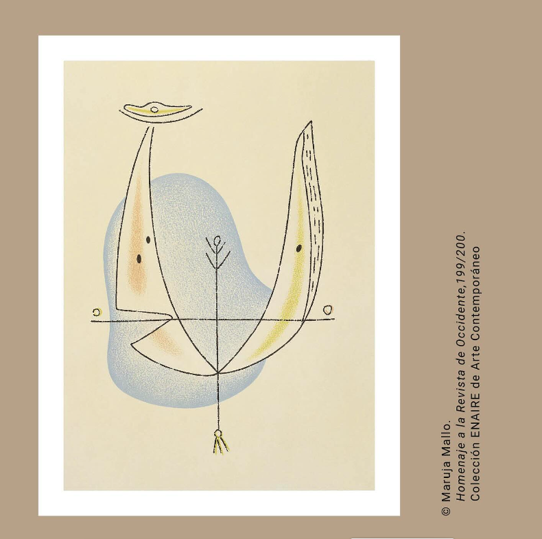 La Fundación ENAIRE expone en el centro de arte Naves de Gamazo, en Santander, Homenaje a la Revista de Occidente, de Maruja Mallo, una selección de seis litografías que fueron realizadas en 1979 por la artista en un libro litográfico de gran tamaño, del que sólo se hicieron 200 ejemplares. Las obras de Maruja Mallo forman parte de la Colección ENAIRE desde 1999.