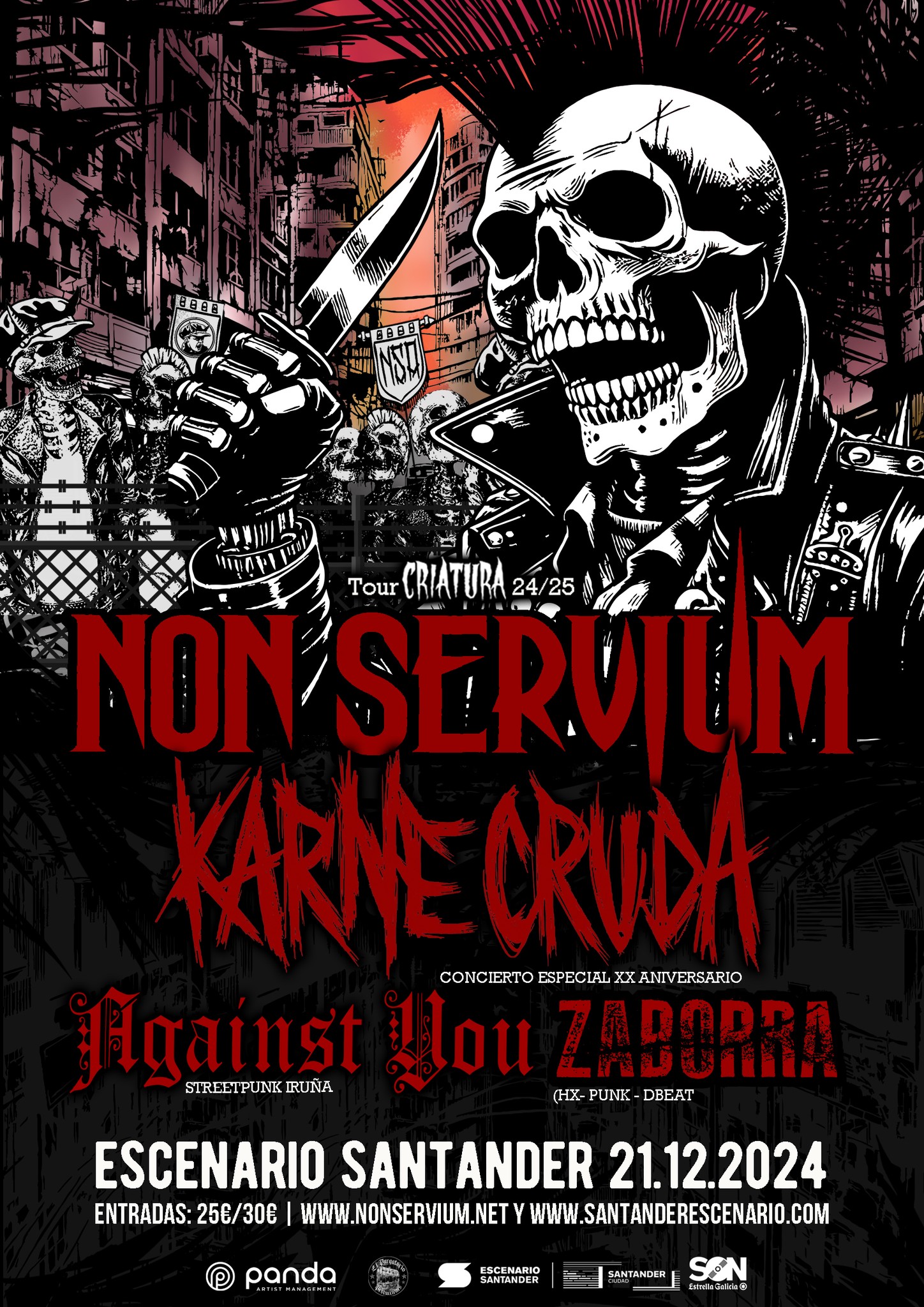 Los combativos y antifascistas Non Servium actuarán este sábado, 21 de diciembre, en Escenario Santander para presentar su último disco ‘Criatura’, en el que claman contra el genocidio que sufre el pueblo palestino, contra el fascismo o contra la esclavitud. Su música, una mezcla de street punk, Oi!, metal y hardcore, toma de nuevo los escenarios para celebrar su 25 aniversario con una formación integrada por Karlitos (voz), Ivi y Snoker (guitarra y coros), Gordo (bajo y coros) y Niño (batería) .