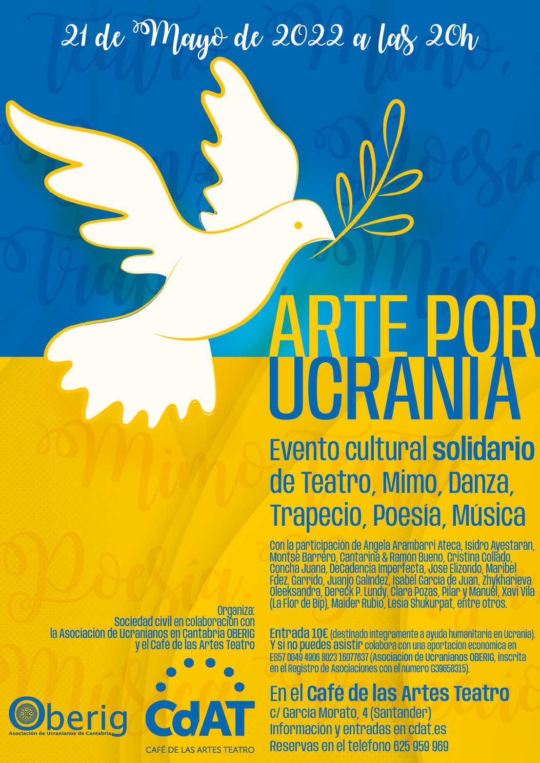 Una veintena de artistas cántabros ofrecerán altruistamente una velada donde la poesía, la música, el mimo, el teatro, el trapecio, serán sus armas para luchar por la paz y la solidaridad a través del arte: Ángela Arambarri Ateca, Isidro Ayestarán, Montse Barrero,Cantarina & Ramón Bueno , Cristina Collado, Concha Juana, DeCadencia imperfecta, Jose Elizondo, Maribel Fdez Garrido, Juanjo Galindez, Isabel García de Juan, Zhykharieva Oleeksandra, Dereck P. Lundy, Clara Pozas, Pilar y Manuel, Xavi Vila (La Flor de Bip) Maider Rubio, Lesia Shukurpat... y más por desvelar.