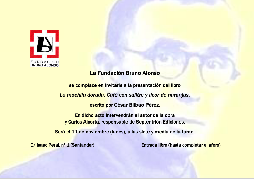 La Fundación Bruno Alonso organiza la presentación del libro “La mochila dorada. Café con salitre y licor de naranjas”, escrito por César Bilbao Pérez.