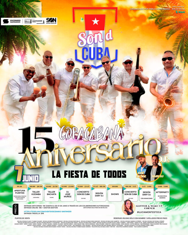 Celebra el15 Aniversario de la sala de baile Copacabana con Son d Cuba. Asiste a una jornada llena de actividades: