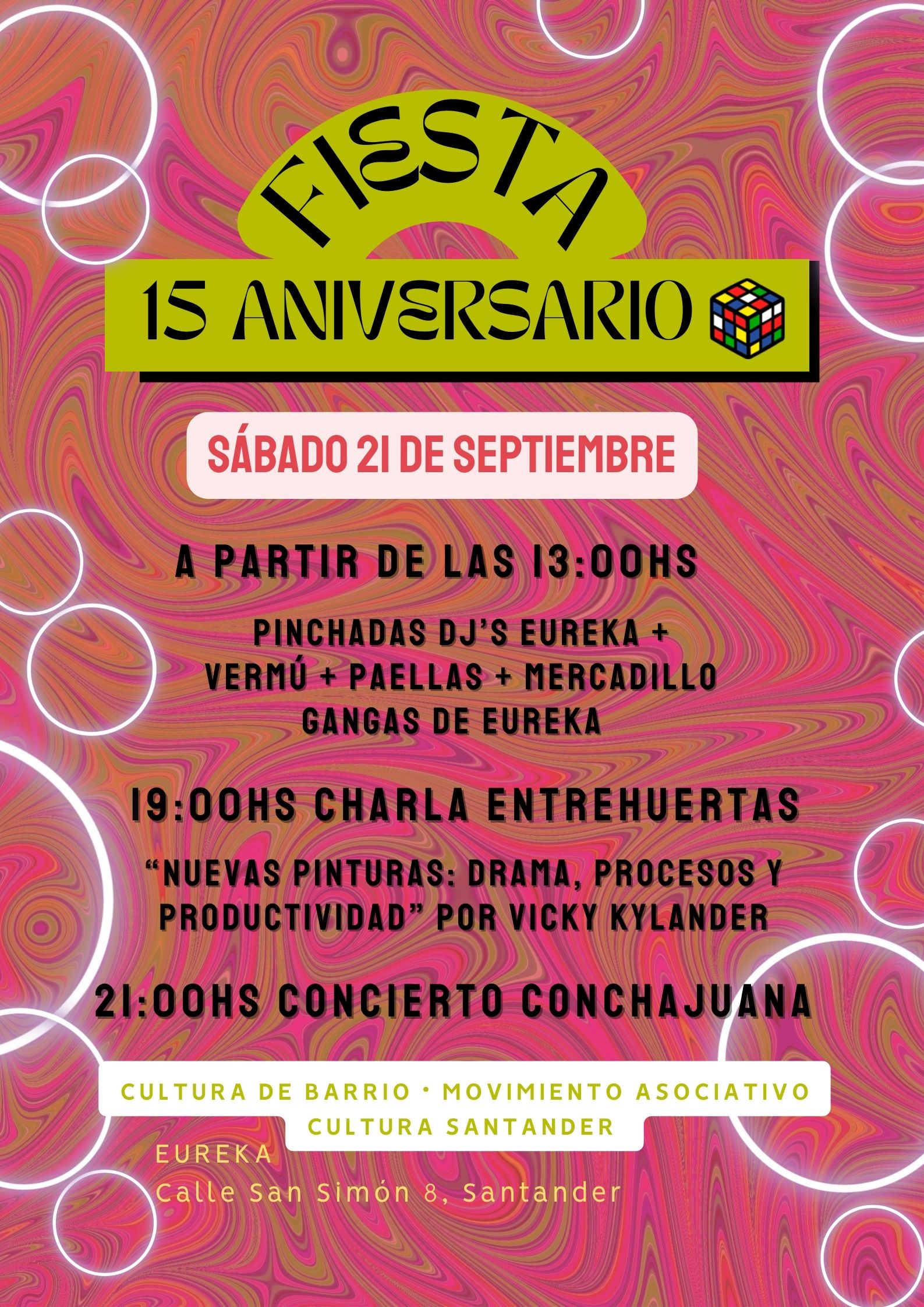 El sábado 21 de septiembre el Centro Cultural Europeo Eureka celebra una fiesta para celebrar su 15 aniversario. Desde las 13 horas habrá pinchadas de vinilos sesión vermú, mercadillo Eureka gangas, comida popular: paellas y sesiones de tarde con café y pastas.