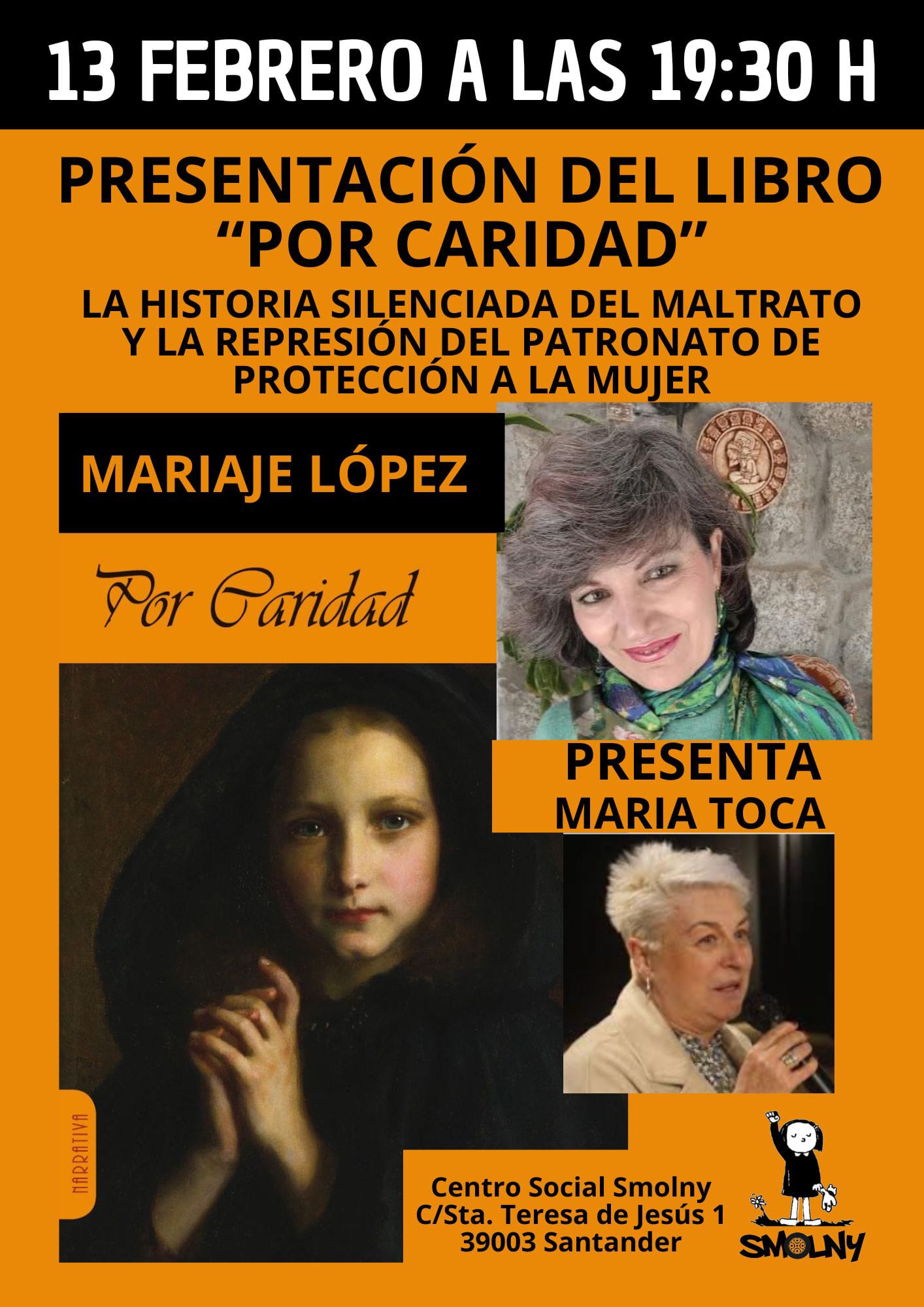 El 13 de febrero a las 19:30 h. María Toca presenta a Mariaje López y su libro "Por caridad", la historia silenciada del maltrato y la represión del Patronato de protección de la mujer.