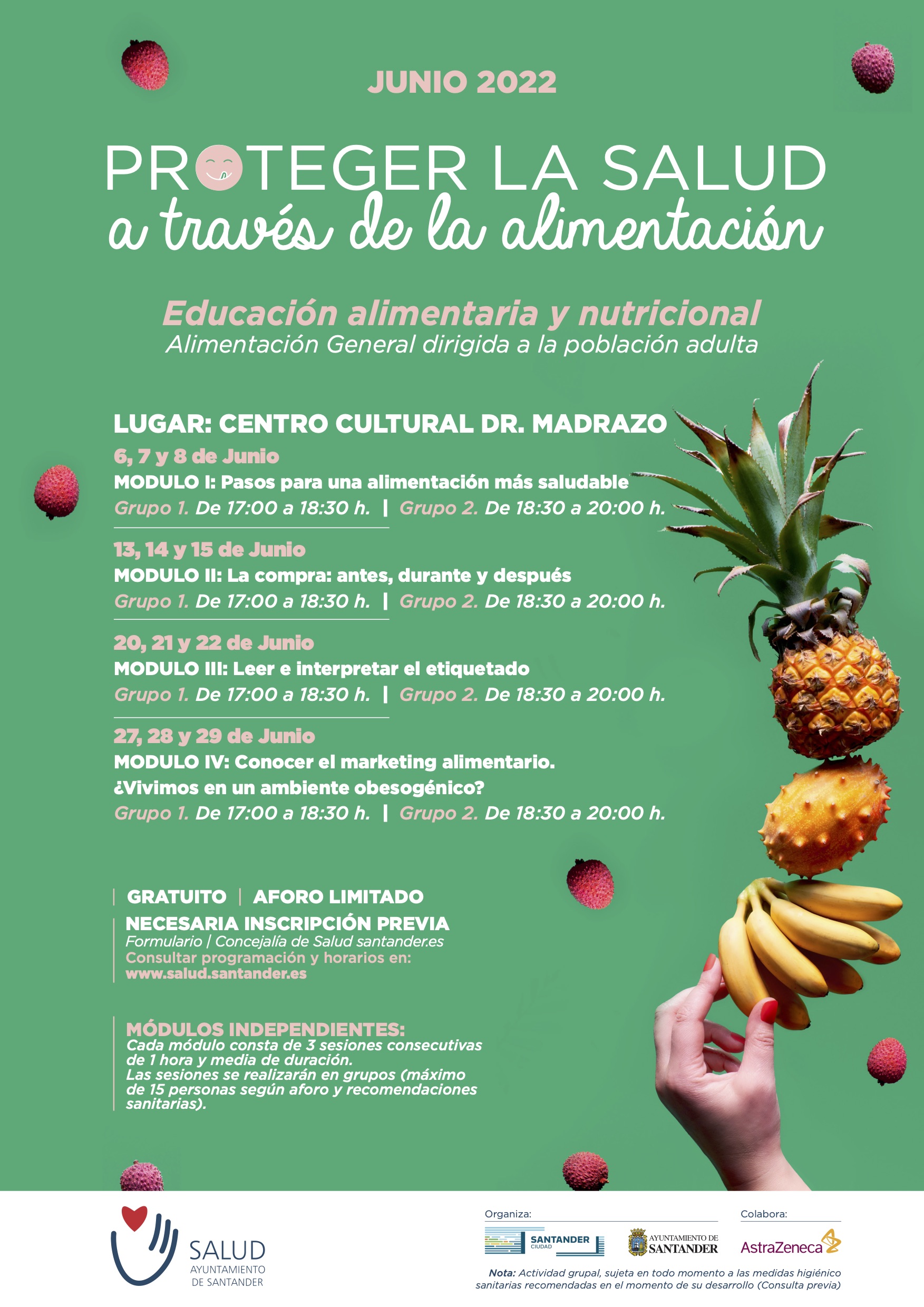 El Servicio de Salud del Ayuntamiento de Santander organiza el taller “Proteger la salud a través de la alimentación”, dirigido a la población adulta. Se impartirá en el Centro Cultural Doctor Madrazo del 6 al 29 de junio.