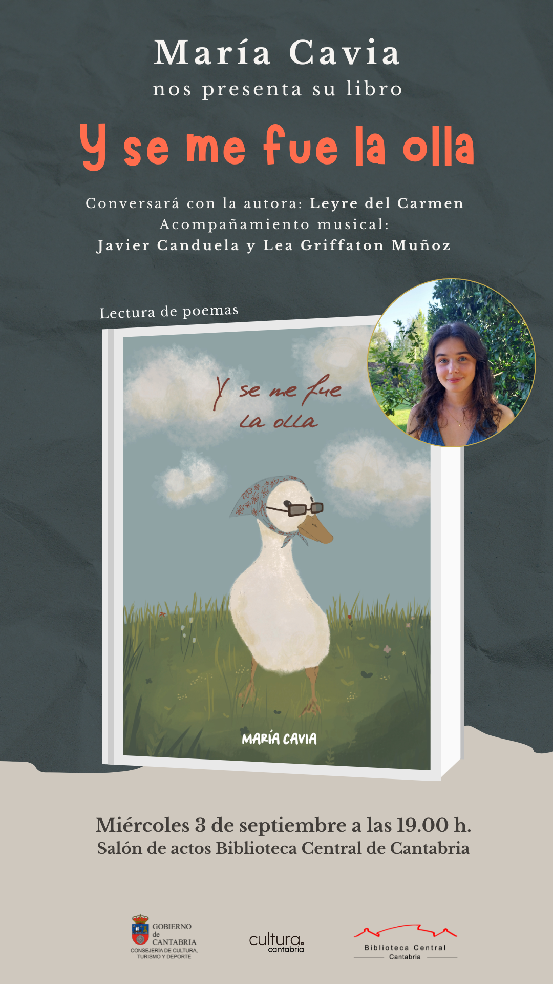 El 3 de septiembre, a partir de las 19.00 h, la Biblioteca Central de Cantabria recibirá a la joven escritora María Cavia, quien presentará su quinto libro, en este caso un poemario titulado Y se me fue la olla.