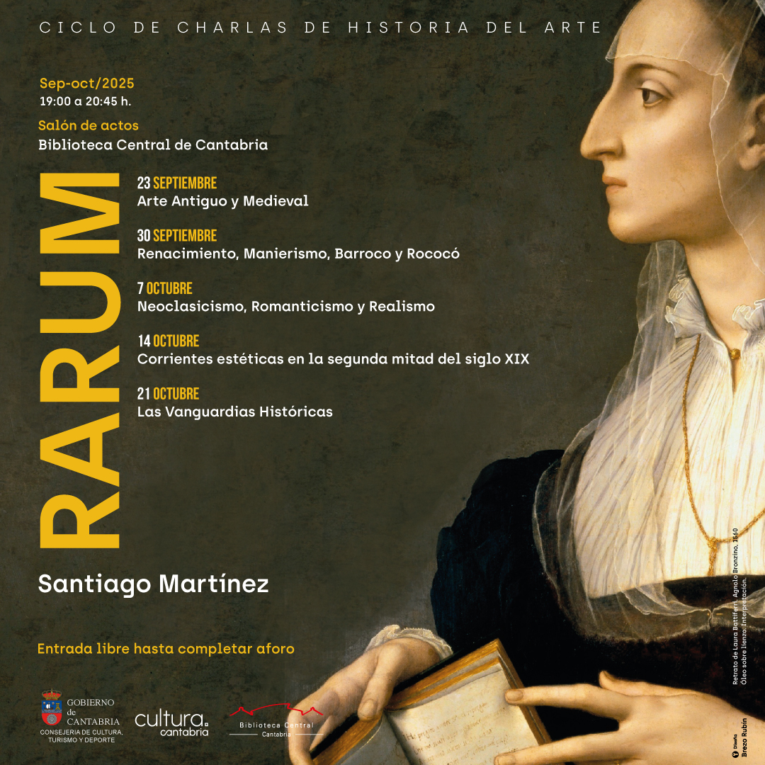 “Rarum” es el título de una serie de charlas sobre Historia del Arte que se plantean con un enfoque claramente didáctico. El objetivo es acercar el arte a todo tipo de púbico de forma sencilla y amena. Serán cinco sesiones entre el 23 de septiembre y el 21 de octubre, que se impartirán los martes, entre las 19.00 y las 20.45 horas en el salón de actos de la Biblioteca Central de Cantabria.