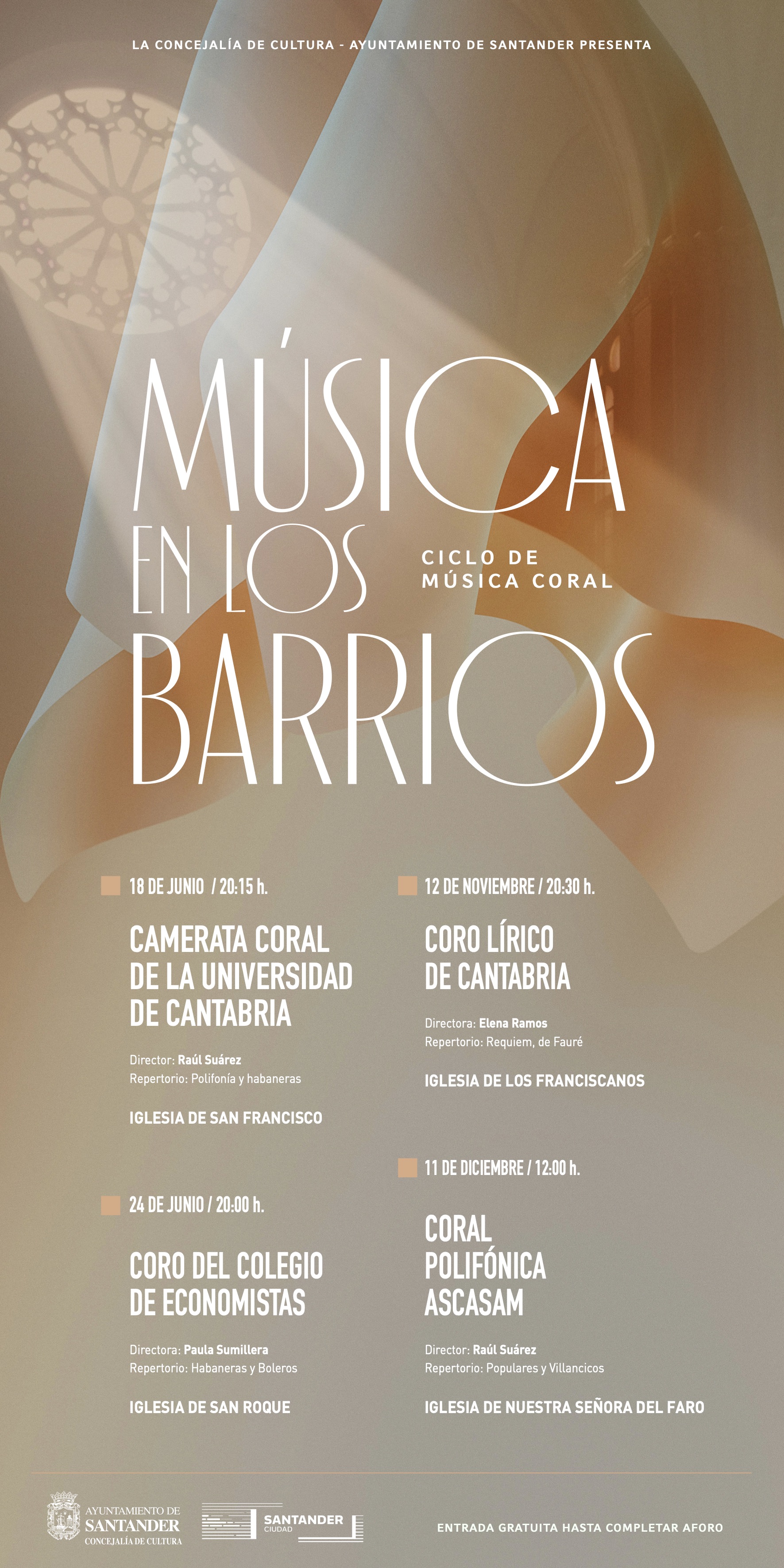 Esta iniciativa se puso en marcha en 2021 con el objetivo de descentralizar la actividad cultural, acercar el canto coral a las zonas periféricas de la ciudad y llamar la atención sobre la arquitectura contemporánea de distintos templos religiosos. Ante la buena aceptación del proyecto la Concejalía ha creído oportuno apostar por esta segunda edición, en la que participan cuatro agrupaciones corales de Santander que llevarán a cabo diferentes programas en cuatro iglesias distintas.