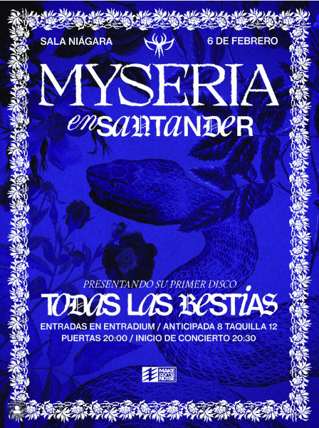 Tras el gran recibimiento de su álbum debut “Todas las Bestias”, la banda cántabra Myseria anuncia su primera y ambiciosa gira nacional, que los llevará por más de diez ciudades españolas entre febrero y noviembre de 2026. Será la primera vez que Myseria se muestre en directo, un paso decisivo para una formación que ha irrumpido con fuerza en la escena alternativa.