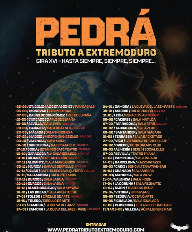 Pedrá (Tributo a Extremoduro) se sitúa en su Gira "XVI", repartiendo rock a raudales y ofreciendo un show más directo y salvaje que nunca por todo el territorio nacional.
