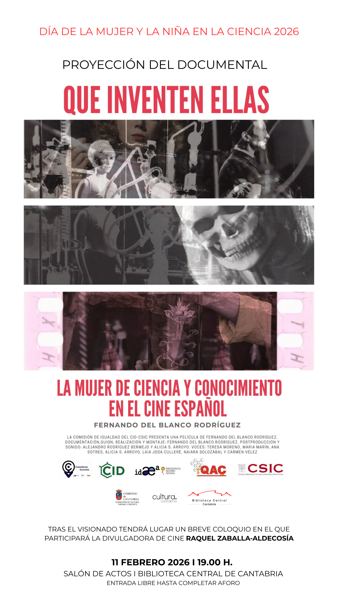 La Asamblea General declaró el 11 de febrero Día Internacional de las Mujeres y las Niñas en la Ciencia en reconocimiento al papel clave que desempeñan las mujeres en la comunidad científica y la tecnología. Para celebrar esta efeméride, la Biblioteca Central de Cantabria ha programado la proyección del documental “Que inventen ellas: la mujer de ciencia y conocimiento en el cine español” (Fernando del Blanco Rodríguez, 2023).