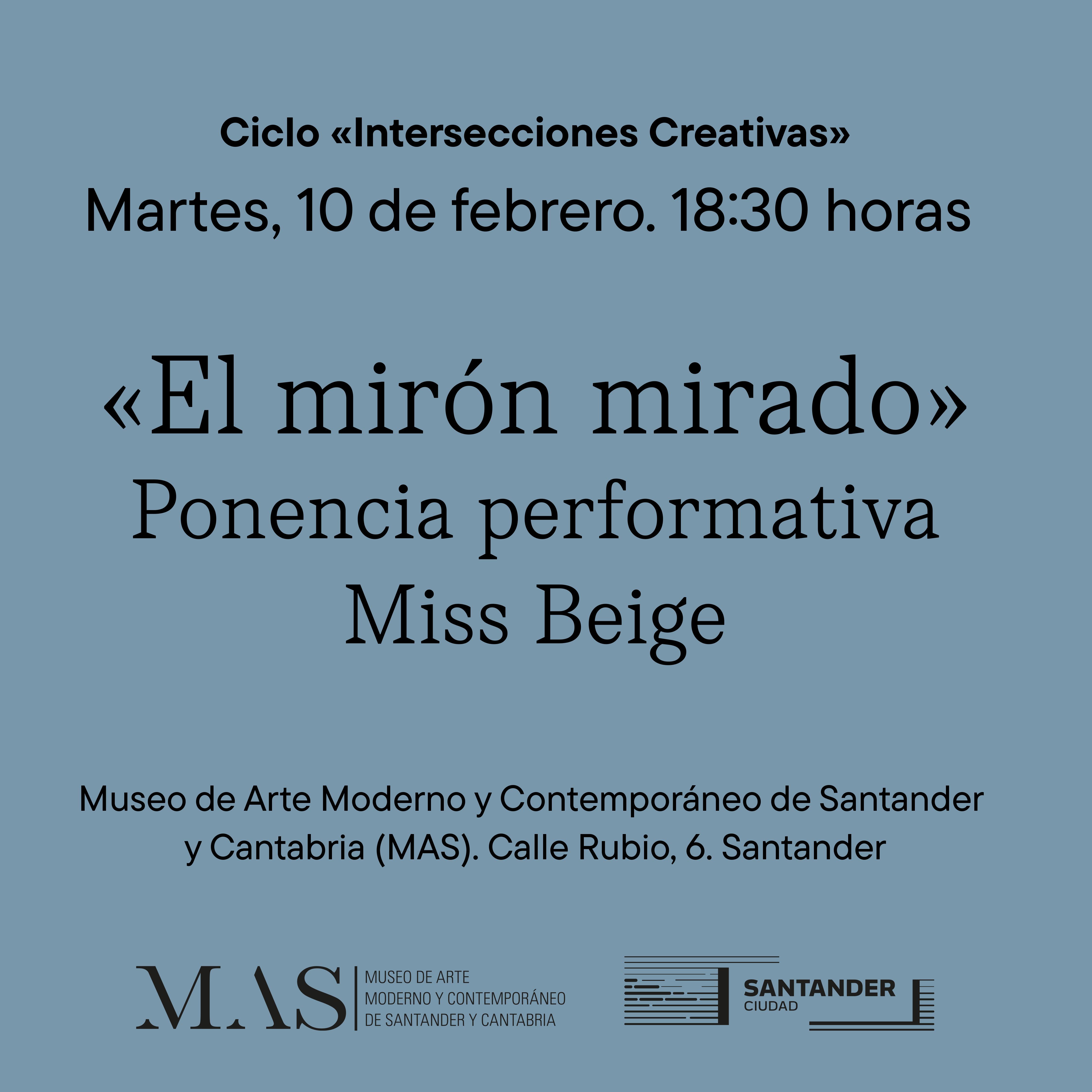El Museo de Arte Moderno y Contemporáneo de Santander y Cantabria (MAS) celebrará el martes, 10 de febrero, a las 18.30 horas, una nueva sesión del ciclo Intersecciones Creativas, diseñado y coordinado por Carmen Quijano. En esta ocasión, estará protagonizada por ‘El mirón mirado’, una charla performática en la que se desvelará el qué, quién, cómo y por qué de Miss Beige, explicada por la propia artista Ana Esmith.