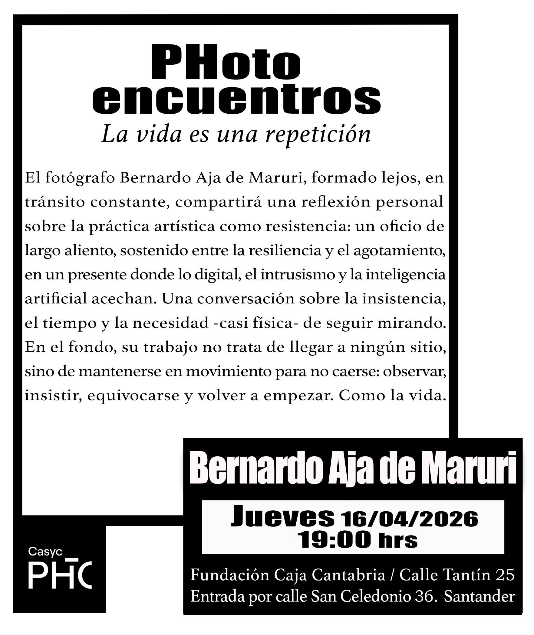El fotógrafo Bernardo Aja de Maruri (Santander, 1973) -formado lejos, en tránsito constante- compartirá una reflexión personal sobre la práctica artística como resistencia: un oficio de largo aliento, sostenido entre la resiliencia y el agotamiento, en un presente donde lo digital, el intrusismo y la inteligencia artificial acechan. Una conversación sobre la insistencia, el tiempo y la necesidad -casi física- de seguir mirando. En el fondo, su trabajo no trata de llegar a ningún sitio, sino de mantenerse en movimiento para no caerse: observar, insistir, equivocarse y volver a empezar. Como los húsares. Como la vida.