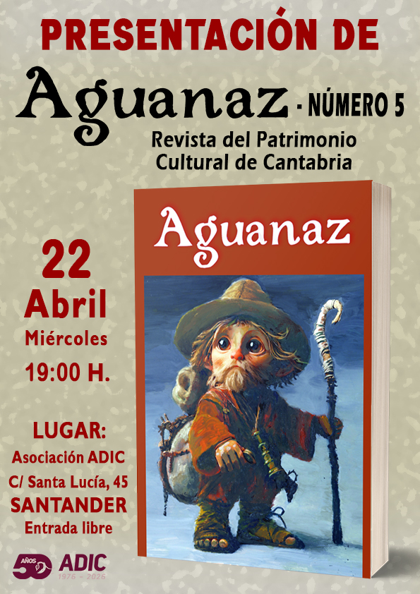 La sede de la Asociación ADIC en Santander acoge el miércoles, 22 de abril, la presentación del número 5 de la revista Aguanaz, especializada en el patrimonio cultural de Cantabria. El evento comenzará a partir de las 19:00 horas, con entrada libre. Esta publicación es editada de forma conjunta por la Asociación para la Defensa de los Intereses de Cantabria (ADIC) y la Asociación Etnocant.