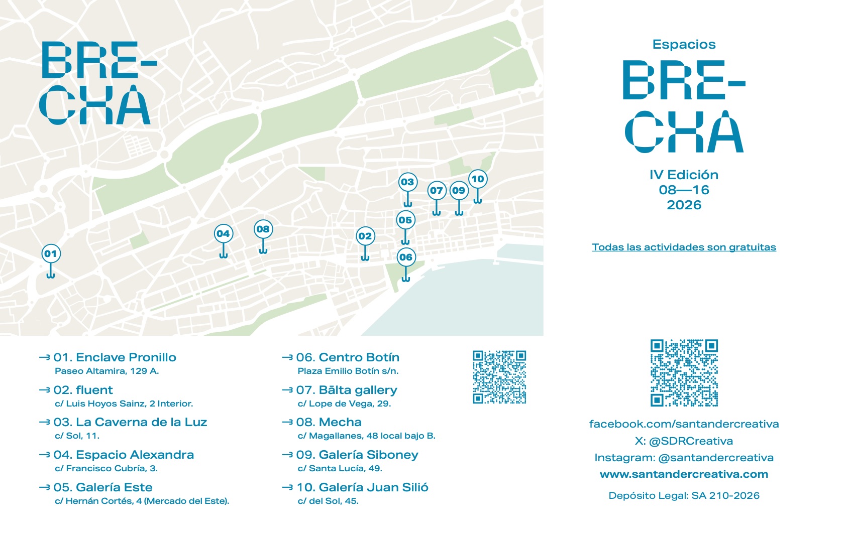 Recorridos guiados, charlas, encuentros y un taller abierto al conjunto de la ciudadanía conforman este año la programación de Espacios Brecha, una iniciativa organizada por la Fundación Santander Creativa (FSC) que se extenderá durante el segundo y tercer fin de semana de mayo, para visibilizar y acercar el trabajo de las galerías y los espacios dedicados a las artes visuales que -de manera estable- desarrollan actividad expositiva en la ciudad.
