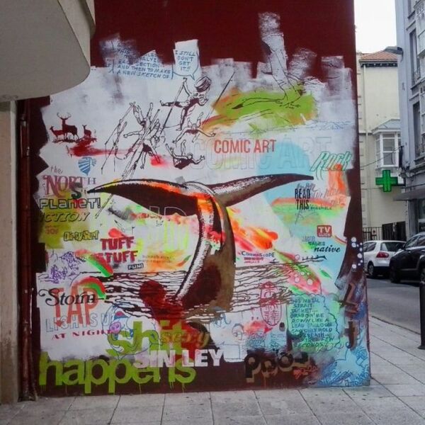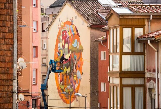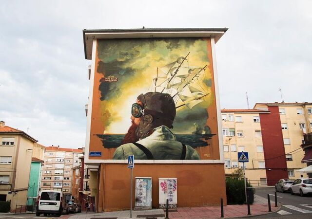 Intervención del artista cántabro 7Pies realizada en 2018 durante el Festival de Arte Público, Desvelarte. En concreto, las intervenciones murales forman parte de la sección que los organizadores denominan 'Huellas'.