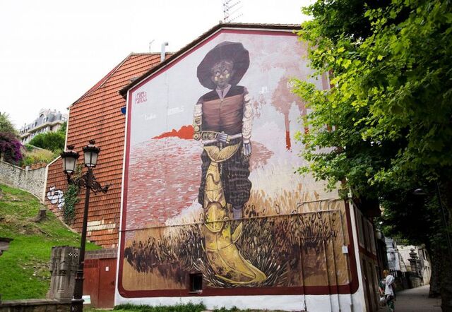Las pinturas murales de Nuria Mora son más de las Huellas dentro del Festival de Arte Urbano Desvelarte, patrocinado cada año por la Fundación Santander Creativa. Su obra lleva expuesta desde octubre de 2014 en la calle del Monte.