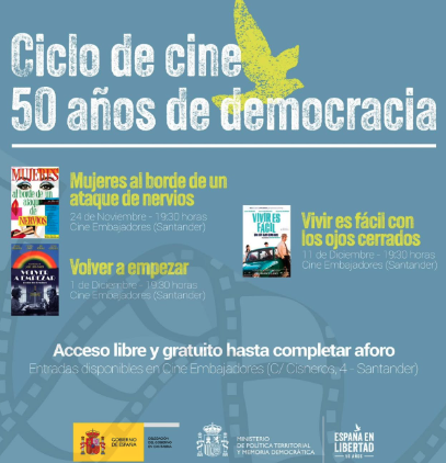 En colaboración con la Delegación del Gobierno en Cantabria y celebrando los 50 años de democracia en España, el Cine Embajadores presenta este ciclo en el que se proyectarán tres películas: Mujeres al borde de un ataque de nervios, Volver a empezar y Vivir es fácil con los ojos cerrados. El acceso es libre, las personas interesadas en asistir tienen que pasar por la taquilla del cine a por las invitaciones (Máximo de 4 por persona, hasta completar aforo).