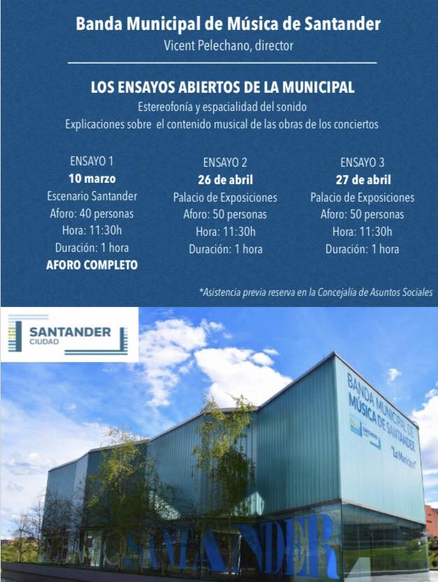 La Banda Municipal en el Palacio de la Magdalena ofrece ensayos abiertos al público los días 26 y 27 de abril a las 11:30 horas en el Palacio de Exposiciones y Congresos de Santander.