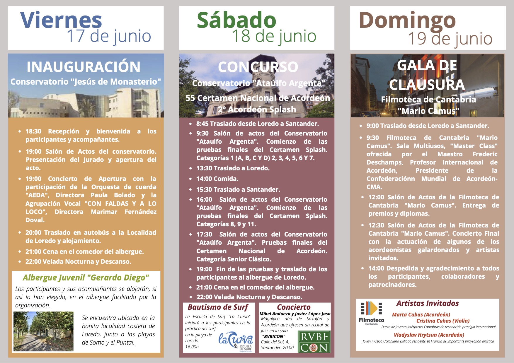 Santander será sede por primera vez del 55 Certamen Nacional de Acordeón, así como del 2º Certamen Acordeón Splash, que organiza la Asociación de Acordeonistas de España – ASACES. Se trata de dos eventos anuales de gran repercusión nacional e internacional en los que se seleccionarán los músicos que representarán a España en el Trofeo Mundial de Acordeón y en el International Open Trophy de la Confederación Mundial de Acordeonistas (CMA).