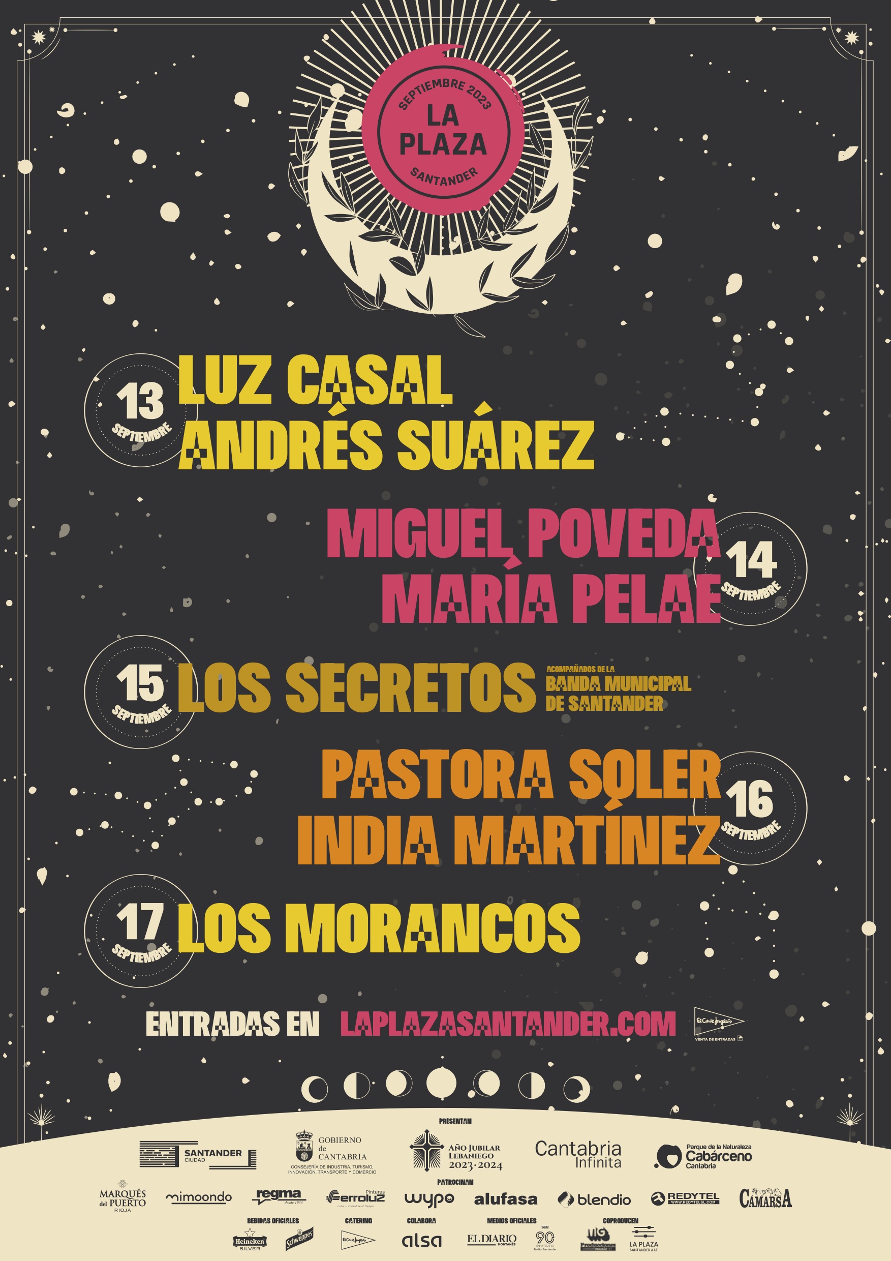 Luz Casal, Andrés Suárez, Miguel Poveda, María Pelae, Los Secretos, Pastora Soler o India Martínez, además del espectáculo humorístico de Los Morancos, protagonizarán la próxima edición del ciclo La Plaza Santander, una propuesta cultural que se celebrará del 13 al 17 de septiembre, con cinco jornadas en las que por tercer año consecutivo se vuelve a dar un uso musical a un espacio emblemático de la ciudad como la Plaza de Toros.