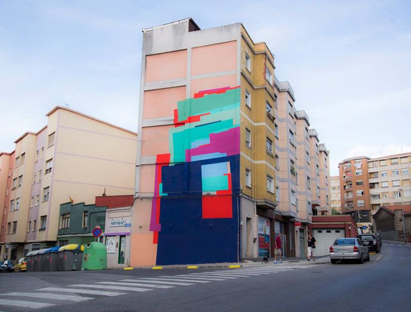 La artista tiene un extenso currículo que respalda el trabajo de esta madrileña cuyos pinceles han viajado desde China hasta Berlín, París, Buenos Aires, Nueva York y gran parte de la geografía española. Tras geométricas formas de colores planos y texturas, se esconde un trabajo muy elaborado que rompe con el discurso del tradicional graffiti.