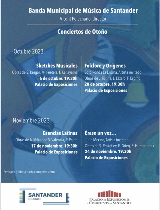 Dentro del ciclo de otoño, la Banda Municipal de Música de Santander ofrece un concierto el viernes 20 de octubre a las 19:30 horas en el Palacio de Exposiciones y Congresos.