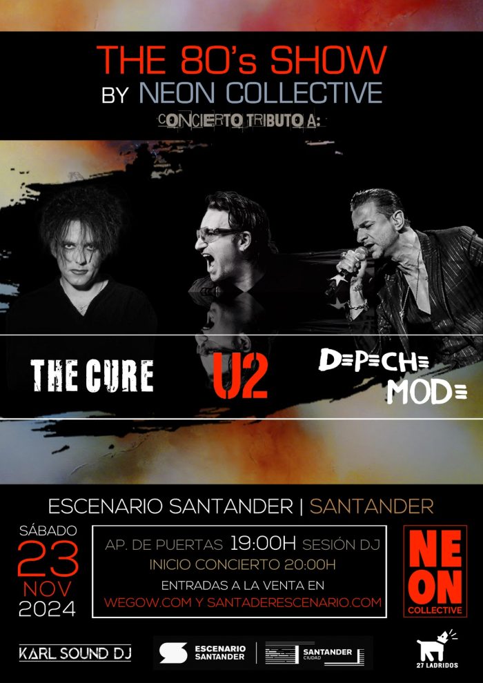 Neon Collective presentan 80´s Show U2 The Cure Depeche Mode. Un show increíble repasando los hits de las bandas U2, The Cure y Depeche Mode, con una puesta en escena de vanguardía y Dj con temazos de los 80 y 90.